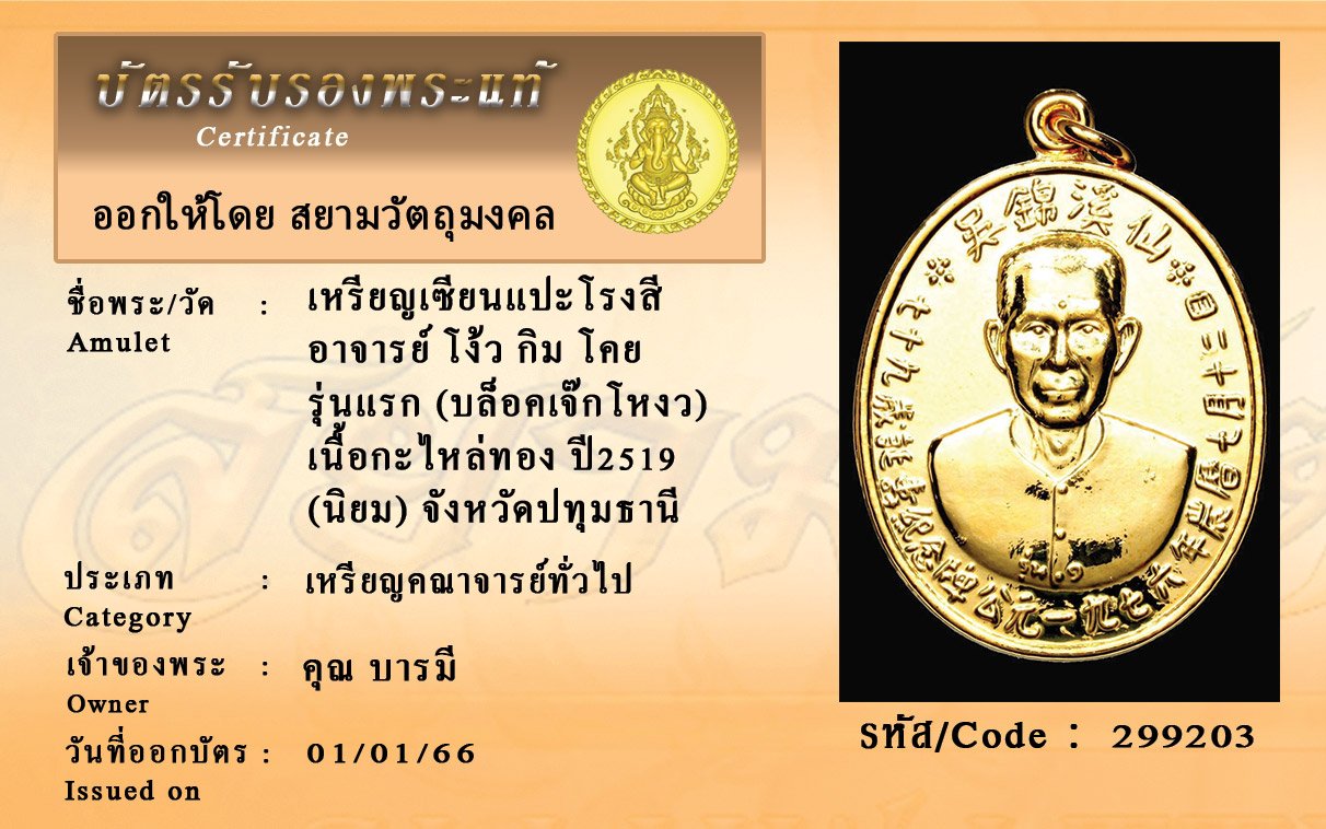 รหัสสินค้า : 299203 เหรียญเซียนแปะโรงสี อาจารย์ โง้ว กิม โคย รุ่นแรก (บล็อคเจ๊กโหงว) เนื้อกะไหล่ทอง ปี2519 (นิยม) จังหวัดปทุมธานี
