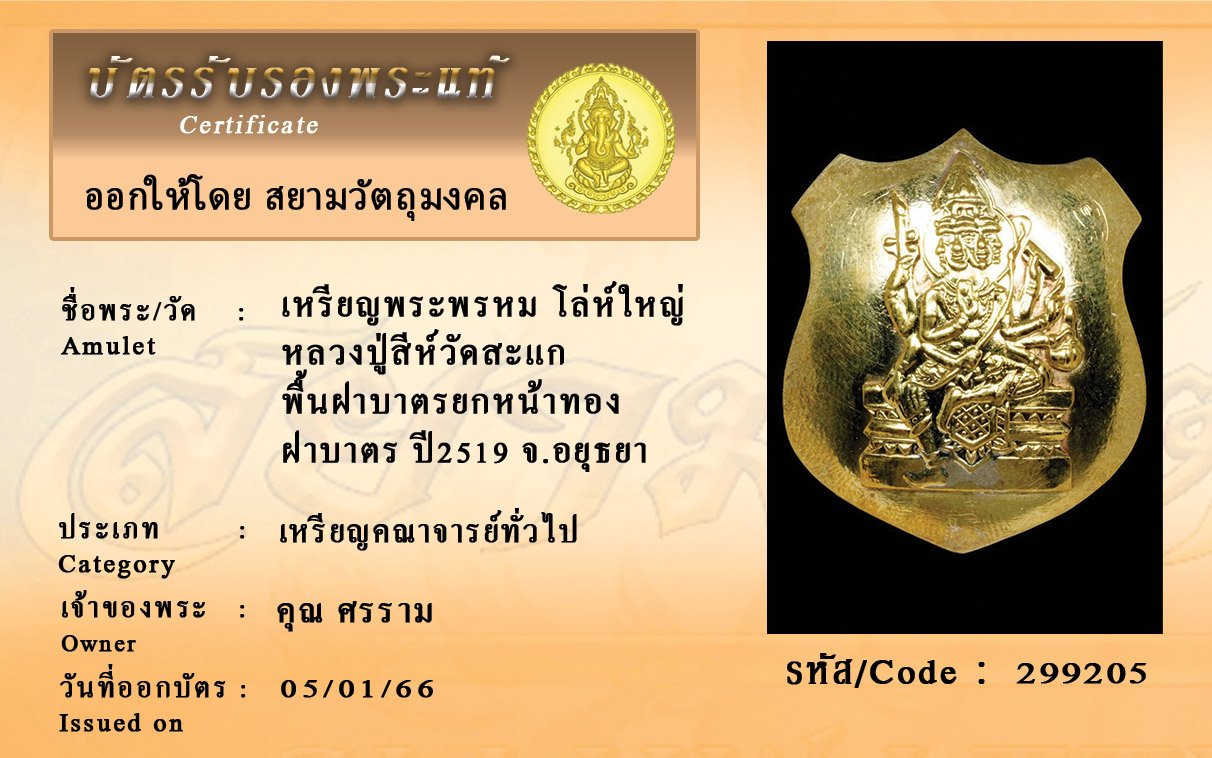 รหัสสินค้า : 299205 เหรียญพระพรหม โล่ห์ใหญ่ หลวงปู่สีห์วัดสะแก พื้นฝาบาตรยกหน้าทอง ฝาบาตร ปี2519 จ.อยุธยา