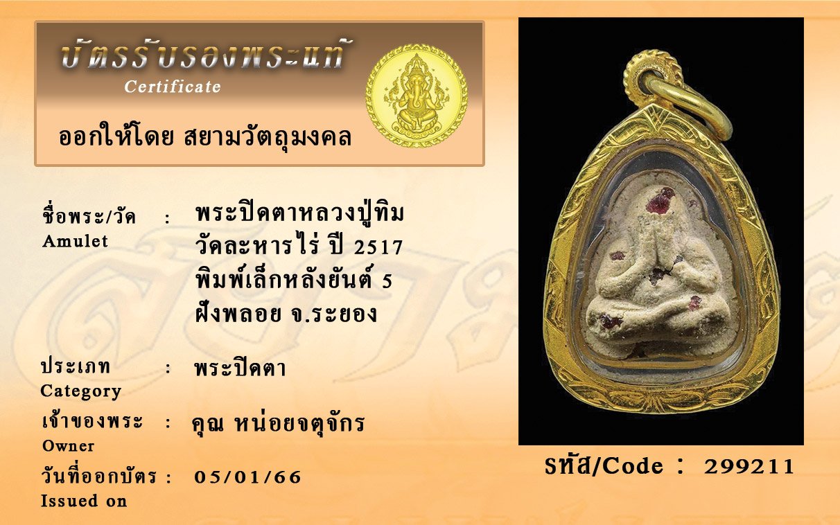 รหัสสินค้า : 299211 พระปิดตาหลวงปู่ทิม วัดละหารไร่ ปี 2517 พิมพ์เล็กหลังยันต์ 5 ฝังพลอย จ.ระยอง