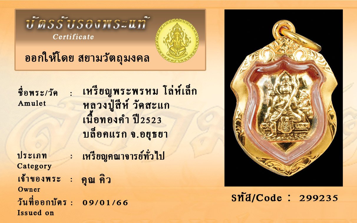 รหัสสินค้า : 299235 เหรียญพระพรหม โล่ห์เล็ก หลวงปู่สีห์ วัดสะแก เนื้อทองคำ ปี2523 บล็อคแรก จ.อยุธยา