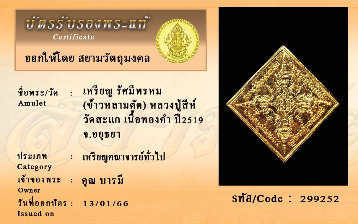 รหัสสินค้า : 299252 เหรียญ รัศมีพรหม (ข้าวหลามตัด) หลวงปู่สีห์ วัดสะแก เนื้อทองคำ ปี2519 จ.อยุธยา