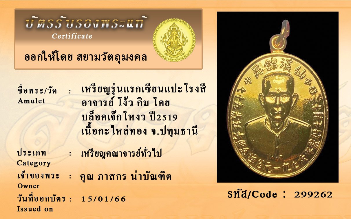 รหัสสินค้า : 299262 เหรียญรุ่นแรกเซียนแปะโรงสี อาจารย์ โง้ว กิม โคย บล็อคเจ๊กโหงว ปี2519 เนื้อกะไหล่ทอง จ.ปทุมธานี
