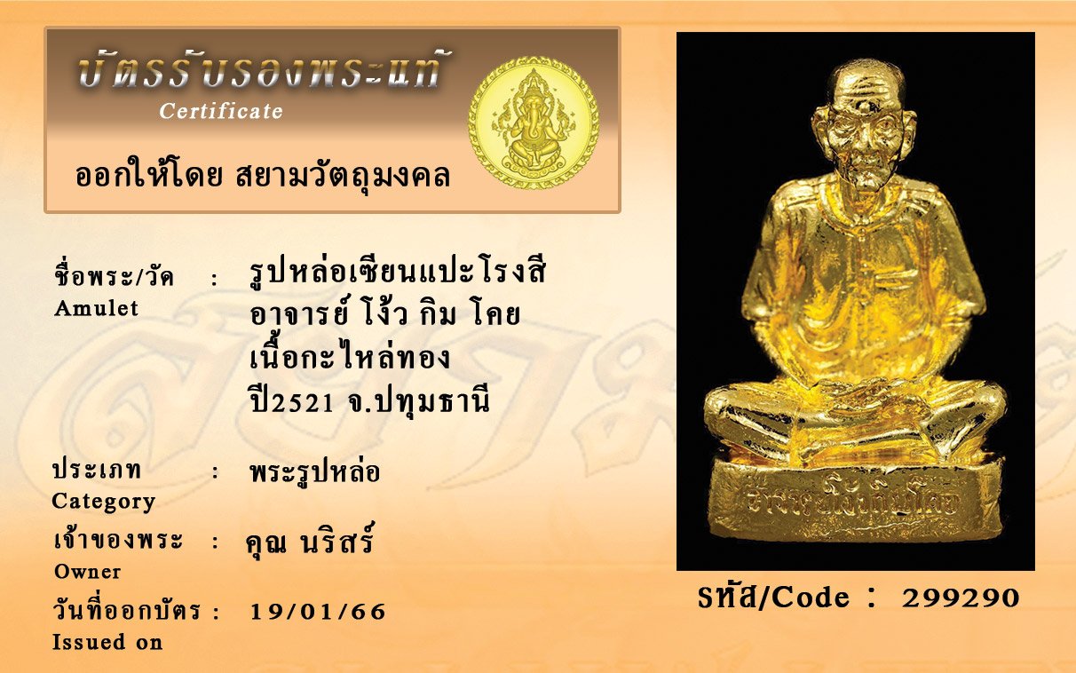 รหัสสินค้า : 299290 รูปหล่อเซียนแปะโรงสี อาจารย์ โง้ว กิม โคย เนื้อกะไหล่ทอง ปี2521 จ.ปทุมธานี