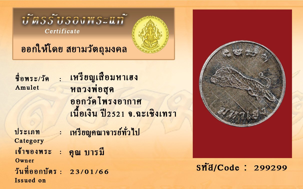 รหัสสินค้า : 299299 เหรียญเสือมหาเฮง หลวงพ่อสุด ออกวัดโพรงอากาศ เนื้อเงิน ปี2521 จ.ฉะเชิงเทรา