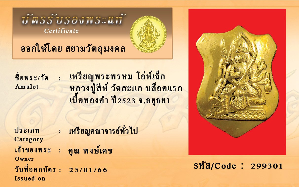 รหัสสินค้า : 299301 เหรียญพระพรหม โล่ห์เล็ก หลวงปู่สีห์ วัดสะแก บล็อคแรก เนื้อทองคำ ปี2523 จ.อยุธยา