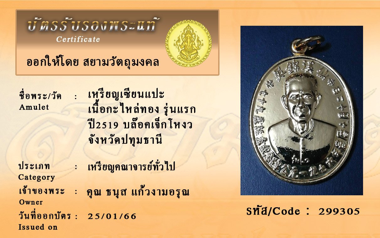 รหัสสินค้า : 299305 เหรียญเซียนแปะ เนื้อกะไหล่ทอง รุ่นแรก ปี2519 บล๊อคเจ็กโหงว จังหวัดปทุมธานี