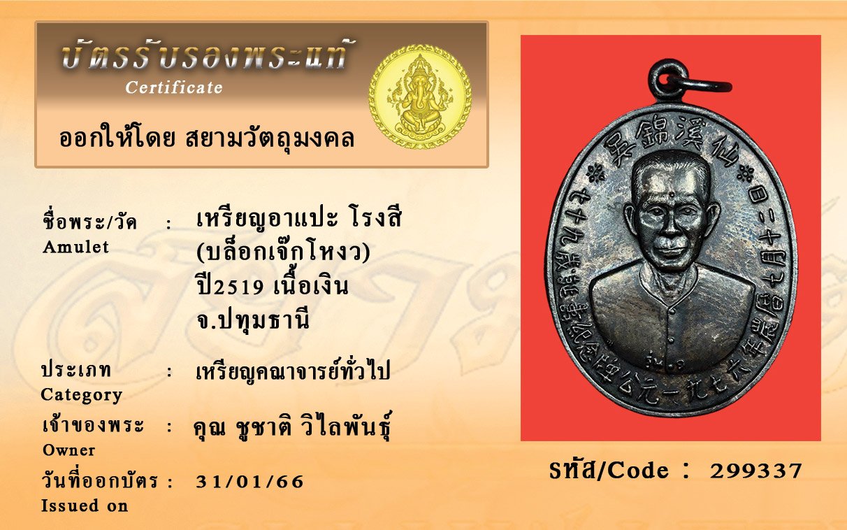 รหัสสินค้า : 299337 เหรียญอาแปะ โรงสี (บล็อกเจ๊กโหงว) ปี2519 เนื้อเงิน จ.ปทุมธานี