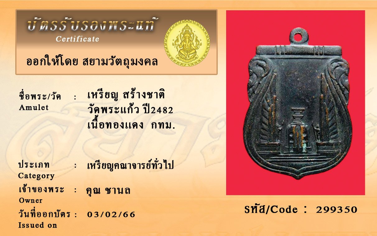 รหัสสินค้า : 299350 เหรียญ สร้างชาติ วัดพระแก้ว ปี2482 เนื้อทองเเดง กทม.
