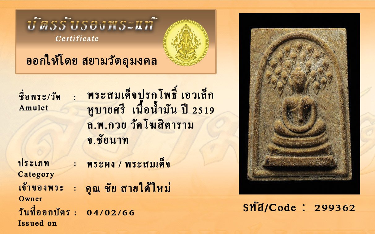 รหัสสินค้า : 299362 พระสมเด็จปรกโพธิ์ เอวเล็ก หูบายศรี เนื้อน้ำมัน ปี 2519 ล.พ.กวย วัดโฆสิตาราม จ.ชัยนาท