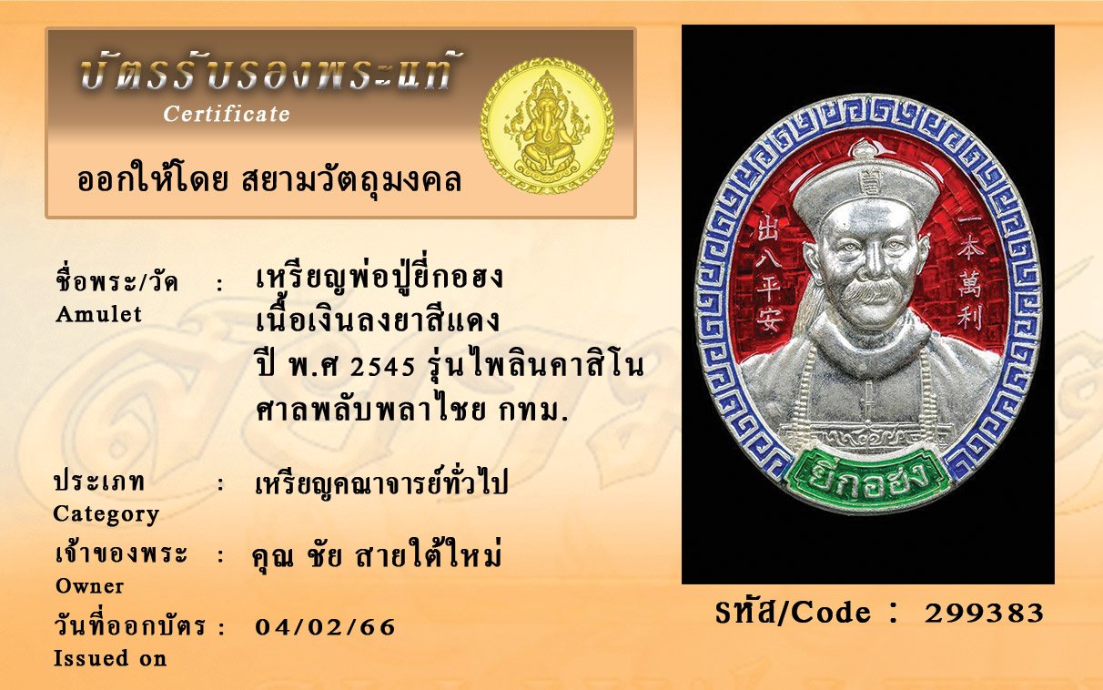 รหัสสินค้า : 299383 เหรียญพ่อปู่ยี่กอฮง เนื้อเงินลงยาสีแดง ปี พ.ศ 2545 รุ่นไพลินคาสิโน ศาลพลับพลาไชย กทม.