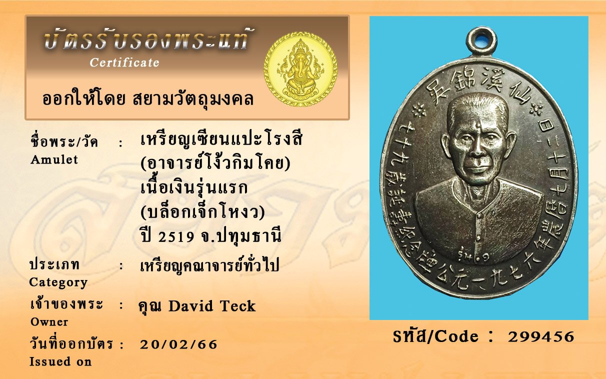 รหัสสินค้า : 299456 เหรียญเซียนแปะโรงสี (อาจารย์โง้วกิมโคย) เนื้อเงินรุ่นแรก (บล็อกเจ็กโหงว) ปี 2519 จ.ปทุมธานี