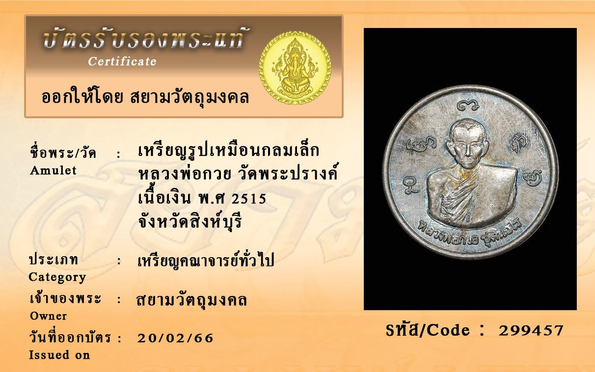รหัสสินค้า : 299457 เหรียญรูปเหมือนกลมเล็ก หลวงพ่อกวย วัดพระปรางค์ เนื้อเงิน พ.ศ 2515 จังหวัดสิงห์บุรี