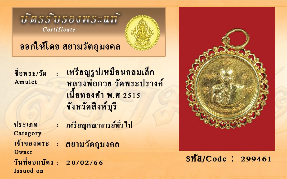 รหัสสินค้า : 299461 เหรียญรูปเหมือนกลมเล็ก หลวงพ่อกวย วัดพระปรางค์ เนื้อทองคำ พ.ศ 2515 จังหวัดสิงห์บุรี