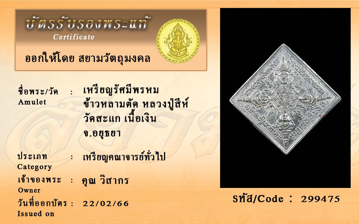 รหัสสินค้า : 299475 เหรียญรัศมีพรหม ข้าวหลามตัด หลวงปู่สีห์ วัดสะแก เนื้อเงิน จ.อยุธยา