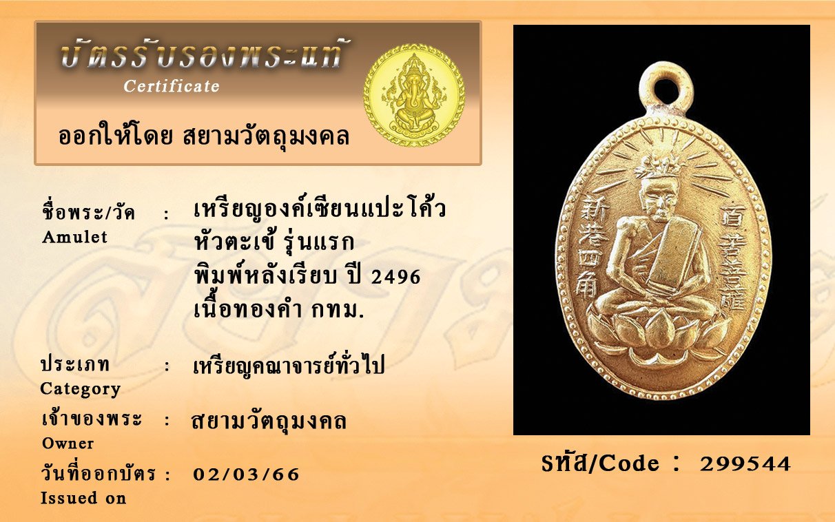รหัสสินค้า : 299544 เหรียญองค์เซียนแปะโค้ว หัวตะเข้ รุ่นแรก พิมพ์หลังเรียบ ปี 2496 เนื้อทองคำ กทม.