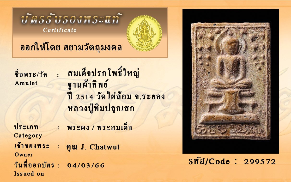 รหัสสินค้า : 299572 สมเด็จปรกโพธิ์ใหญ่ ฐานผ้าทิพย์ ปี 2514 วัดไผ่ล้อม จ.ระยอง หลวงปู่ทิมปลุกเสก