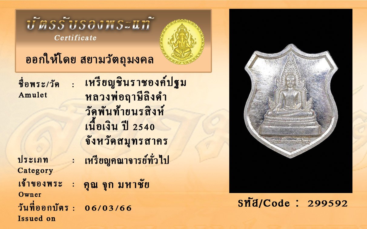 รหัสสินค้า : 299592 เหรียญชินราชองค์ปฐม หลวงพ่อฤาษีลิงดำ วัดพันท้ายนรสิงห์ เนื้อเงิน ปี 2540 จังหวัดสมุทรสาคร