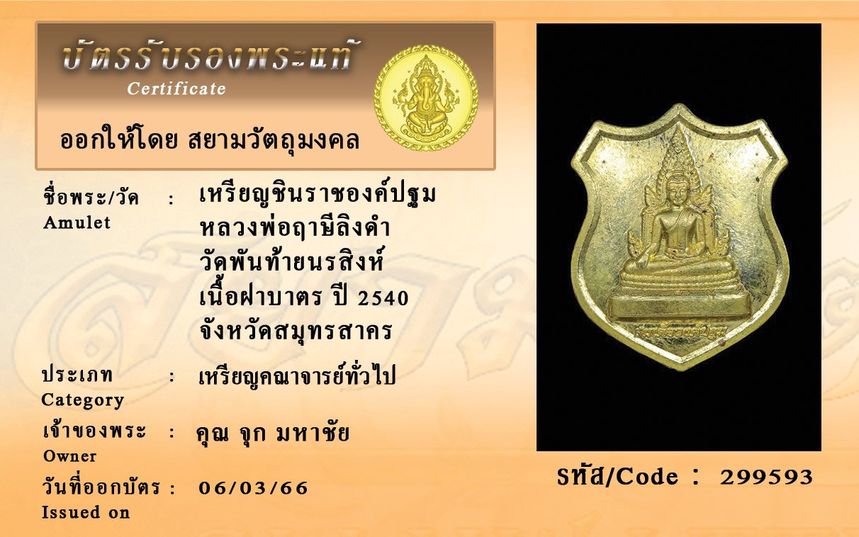 รหัสสินค้า : 299593 เหรียญชินราชองค์ปฐม หลวงพ่อฤาษีลิงดำ วัดพันท้ายนรสิงห์ เนื้อฝาบาตร ปี 2540 จังหวัดสมุทรสาคร