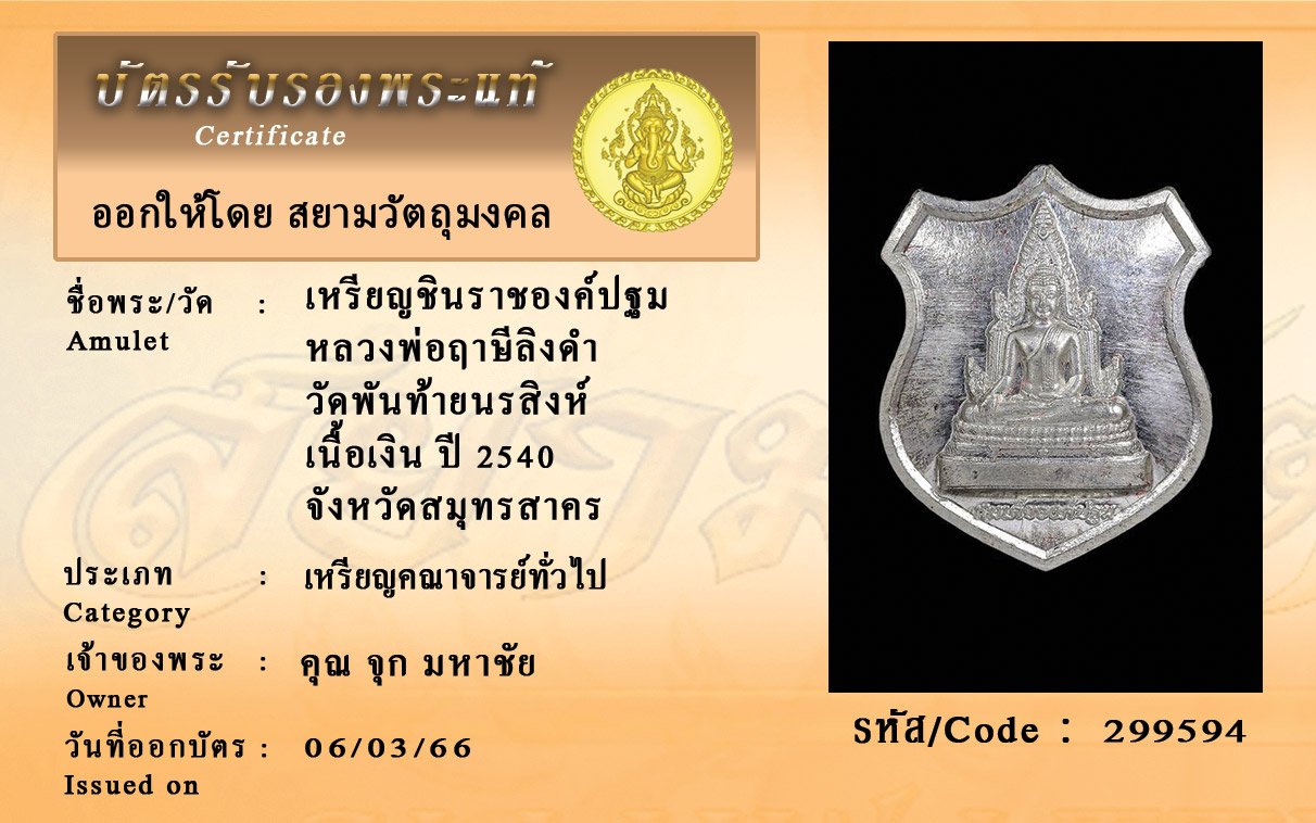 รหัสสินค้า : 299594 เหรียญชินราชองค์ปฐม หลวงพ่อฤาษีลิงดำ วัดพันท้ายนรสิงห์ เนื้อเงิน ปี 2540 จังหวัดสมุทรสาคร