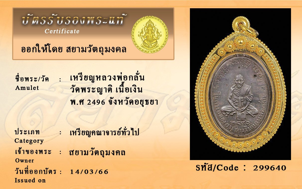รหัสสินค้า : 299640 เหรียญหลวงพ่อกลั่น วัดพระญาติ เนื้อเงิน พ.ศ 2496 จังหวัดอยุธยา