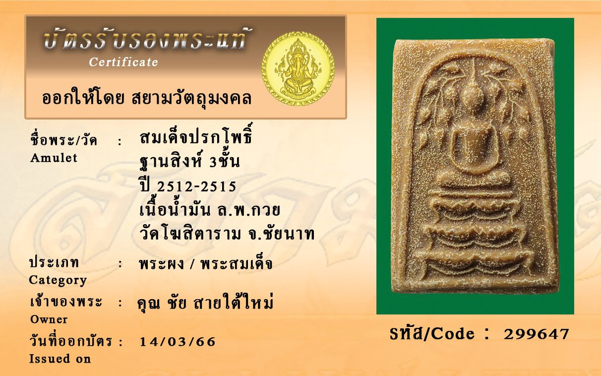 รหัสสินค้า : 299647 สมเด็จปรกโพธิ์ ฐานสิงห์ 3ชั้น ปี 2512-2515 เนื้อน้ำมัน ล.พ.กวย วัดโฆสิตาราม จ.ชัยนาท
