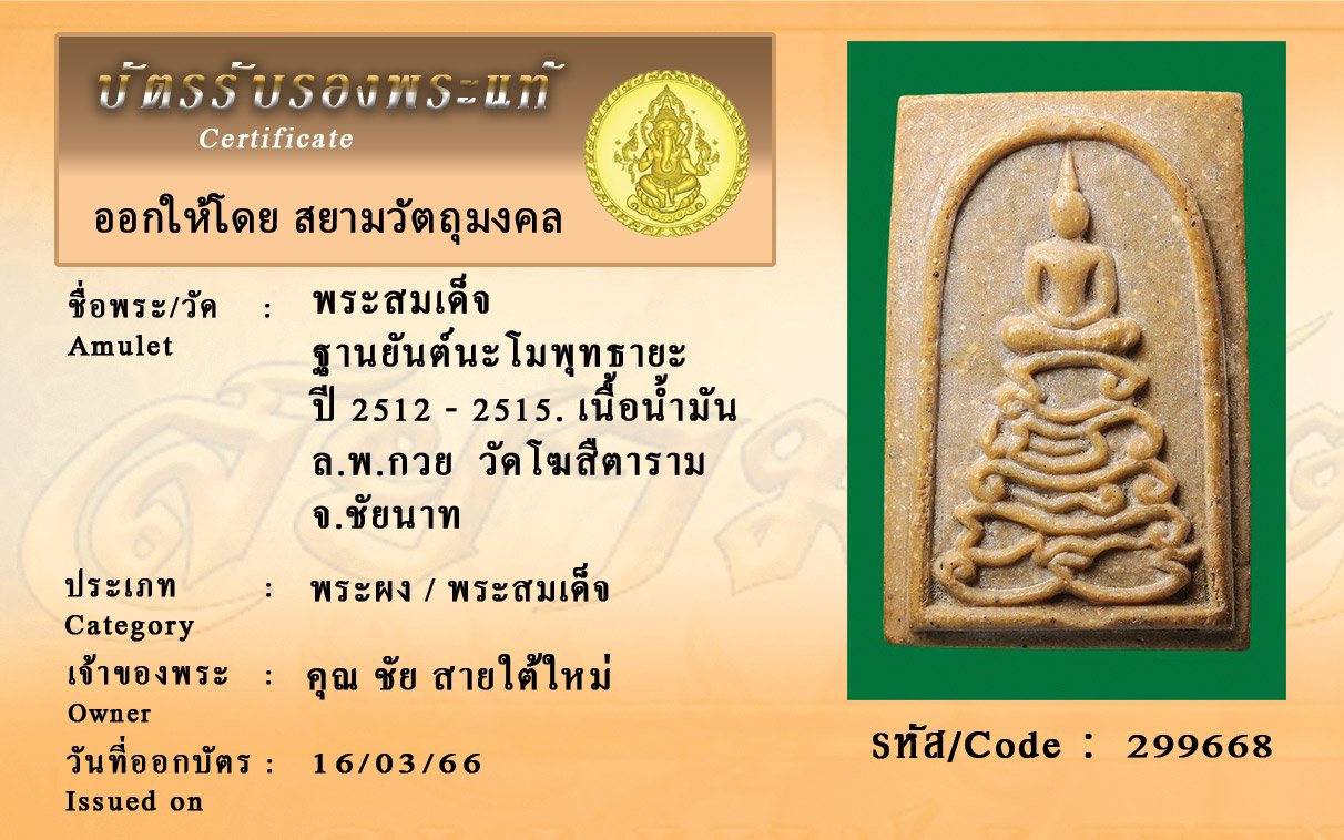 รหัสสินค้า : 299668 พระสมเด็จ ฐานยันต์นะโมพุทธายะ ปี 2512 - 2515. เนื้อน้ำมัน ล.พ.กวย วัดโฆสืตาราม จ.ชัยนาท