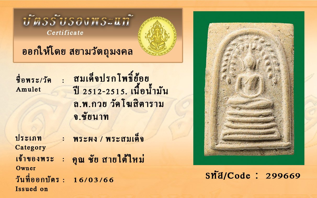 รหัสสินค้า : 299669 สมเด็จปรกโพธิ์ย้อย ปี 2512-2515. เนื้อน้ำมัน ล.พ.กวย วัดโฆสิตาราม จ.ชัยนาท