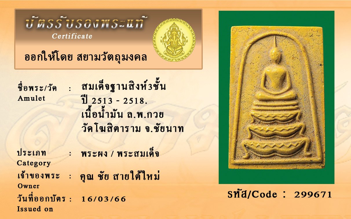 รหัสสินค้า : 299671 สมเด็จฐานสิงห์3ชั้น ปี 2513 - 2518. เนื้อน้ำมัน ล.พ.กวย วัดโฆสิตาราม จ.ชัยนาท