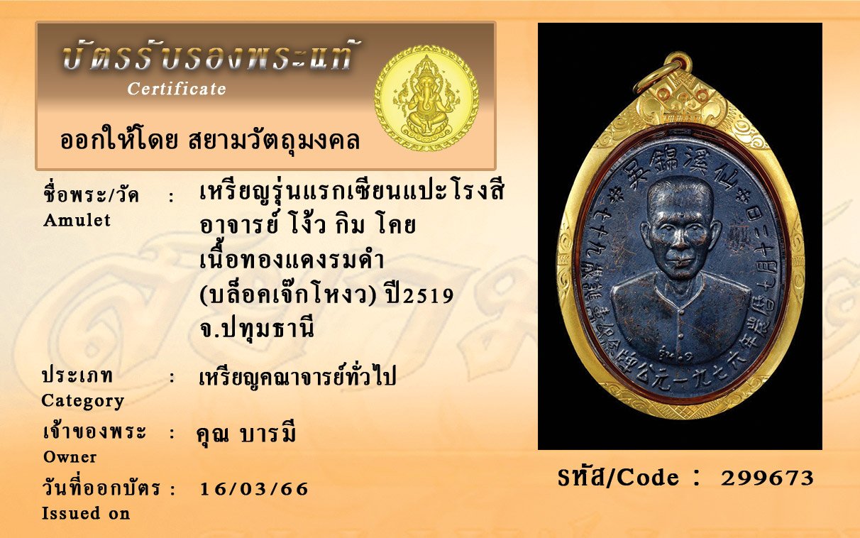 รหัสสินค้า : 299673 เหรียญรุ่นแรกเซียนแปะโรงสี อาจารย์ โง้ว กิม โคย เนื้อทองแดงรมดำ (บล็อคเจ๊กโหงว) ปี2519 จ.ปทุมธานี