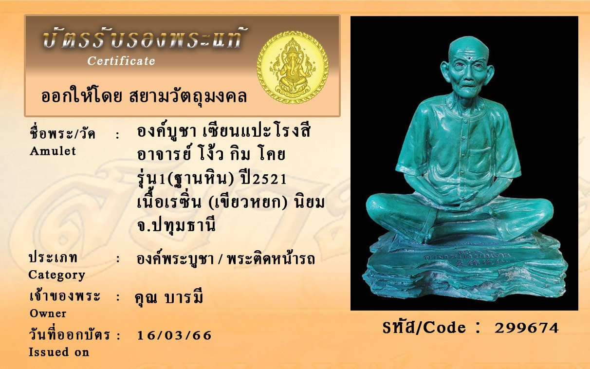 รหัสสินค้า : 299674 องค์บูชา เซียนแปะโรงสี อาจารย์ โง้ว กิม โคย รุ่น1(ฐานหิน) ปี2521 เนื้อเรซิ่น (เขียวหยก) นิยม จ.ปทุมธานี