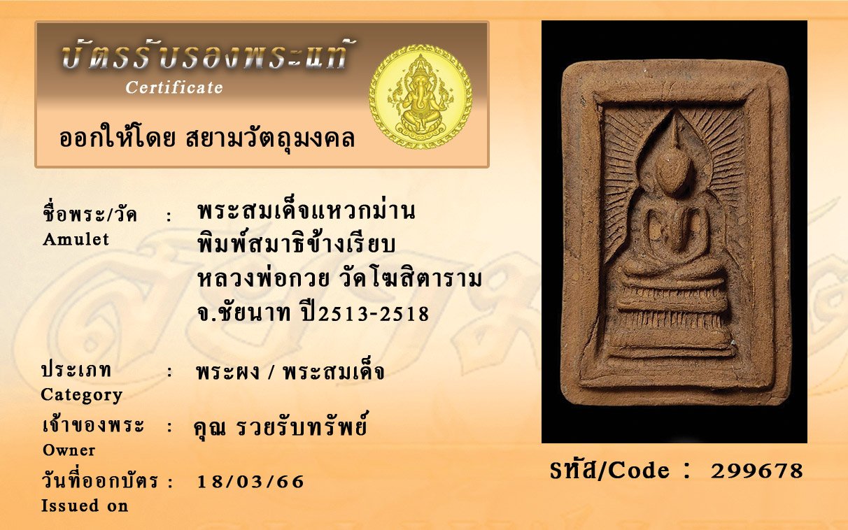 รหัสสินค้า : 299678 พระสมเด็จแหวกม่าน พิมพ์สมาธิข้างเรียบ หลวงพ่อกวย วัดโฆสิตาราม จ.ชัยนาท ปี2513-2518