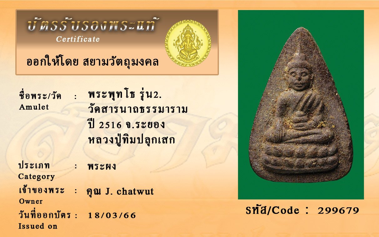 รหัสสินค้า : 299679 พระพุทโธ รุ่น2. วัดสารนาถธรรมาราม ปี 2516 จ.ระยอง หลวงปู่ทิมปลุกเสก
