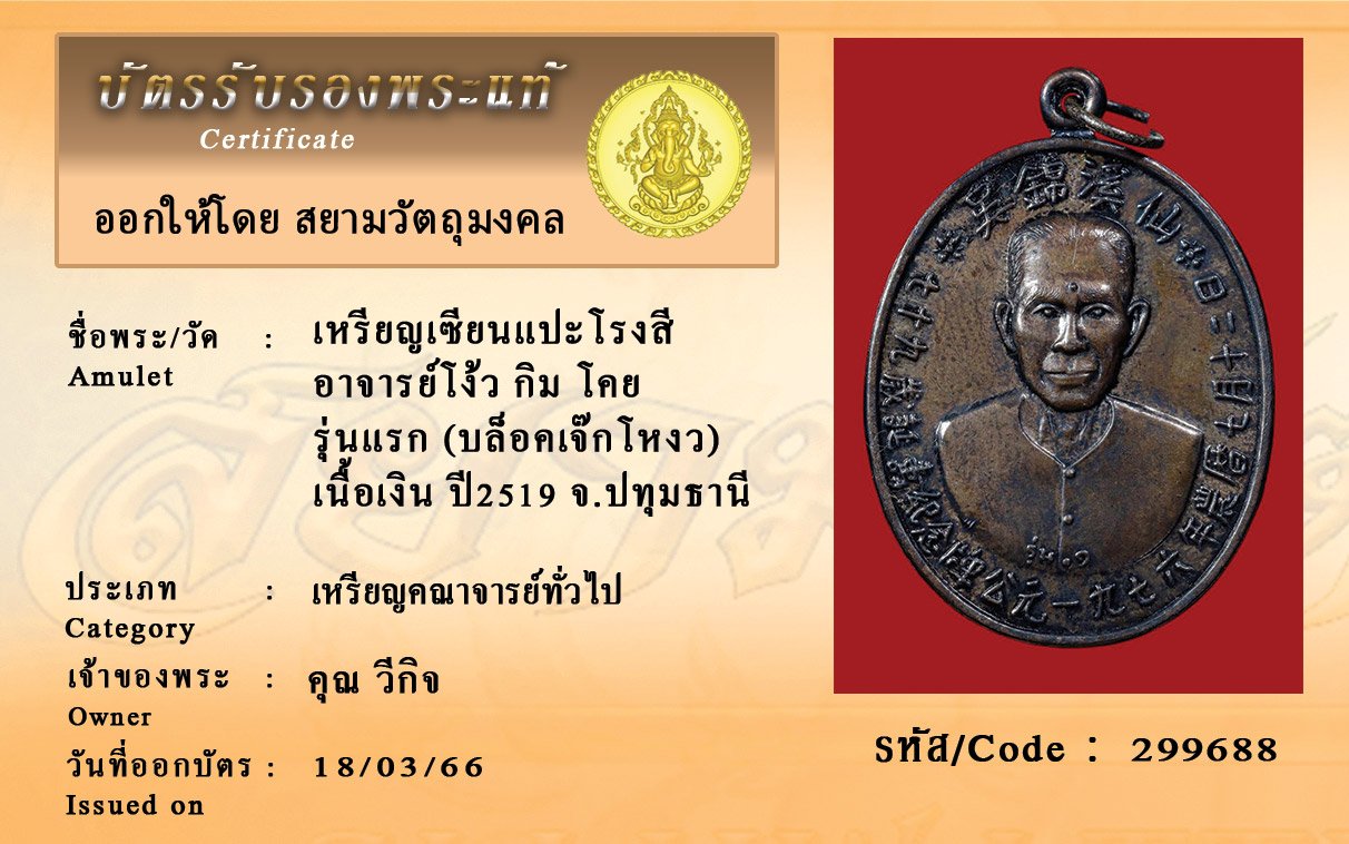 รหัสสินค้า : 299688 เหรียญเซียนแปะโรงสี อาจารย์โง้ว กิม โคย รุ่นแรก (บล็อคเจ๊กโหงว) เนื้อเงิน ปี2519 จ.ปทุมธานี
