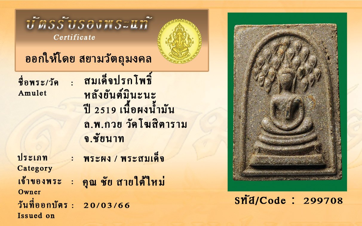 รหัสสินค้า : 299708 สมเด็จปรกโพธิ์ หลังยันต์มินะนะ ปี 2519 เนื้อผงน้ำมัน ล.พ.กวย วัดโฆสิตาราม จ.ชัยนาท