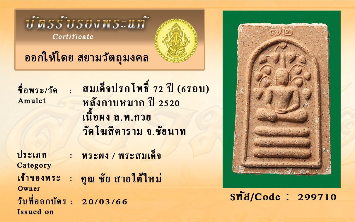 รหัสสินค้า : 299710 สมเด็จปรกโพธิ์ 72 ปี (6รอบ) หลังกาบหมาก ปี 2520 เนื้อผง ล.พ.กวย วัดโฆสิตาราม จ.ชัยนาท