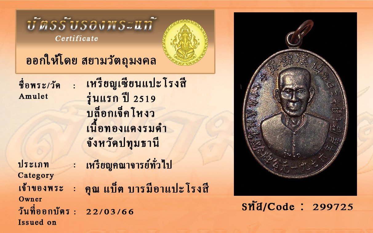 รหัสสินค้า : 299725 เหรียญเซียนแปะโรงสี รุ่นแรก ปี 2519 บล็อกเจ็คโหงว เนื้อทองแดงรมดำ จังหวัดปทุมธานี