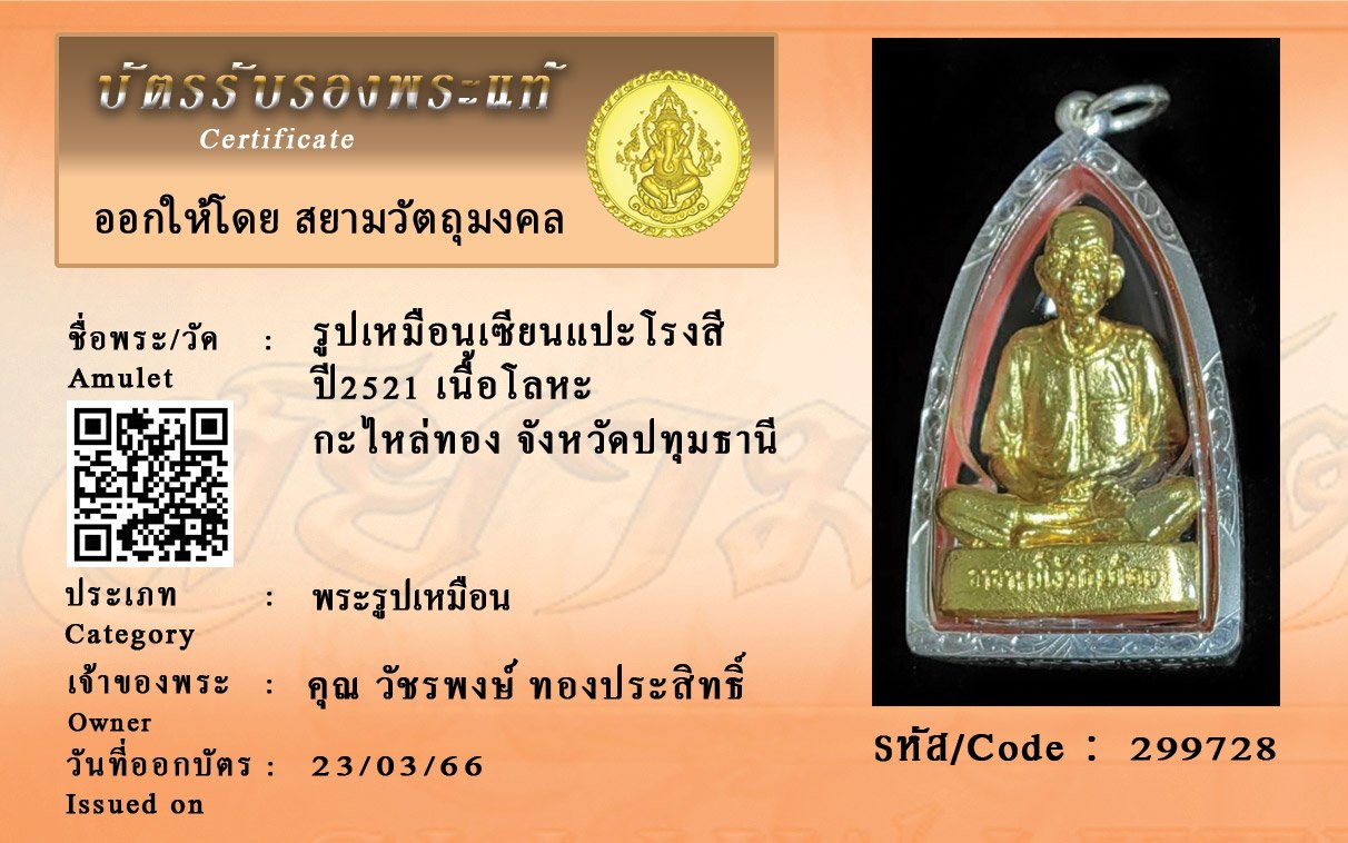 รหัสสินค้า : 299728 รูปเหมือนเซียนแปะโรงสี ปี2521 เนื้อโลหะ กะไหล่ทอง จังหวัดปทุมธานี คุณ วัชรพงษ์ ทองประสิทธิ์