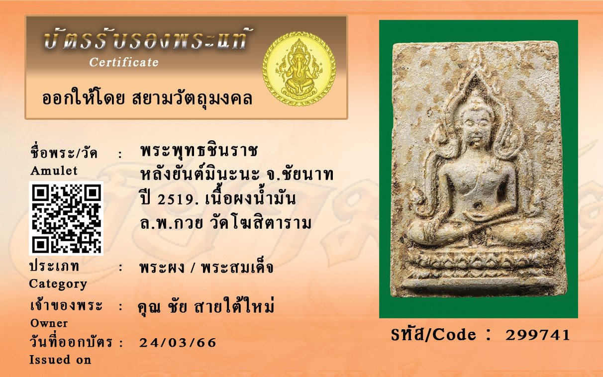 รหัสสินค้า : 299741 พระพุทธชินราช หลังยันต์มินะนะ จ.ชัยนาท ปี 2519. เนื้อผงน้ำมัน ล.พ.กวย วัดโฆสิตาราม