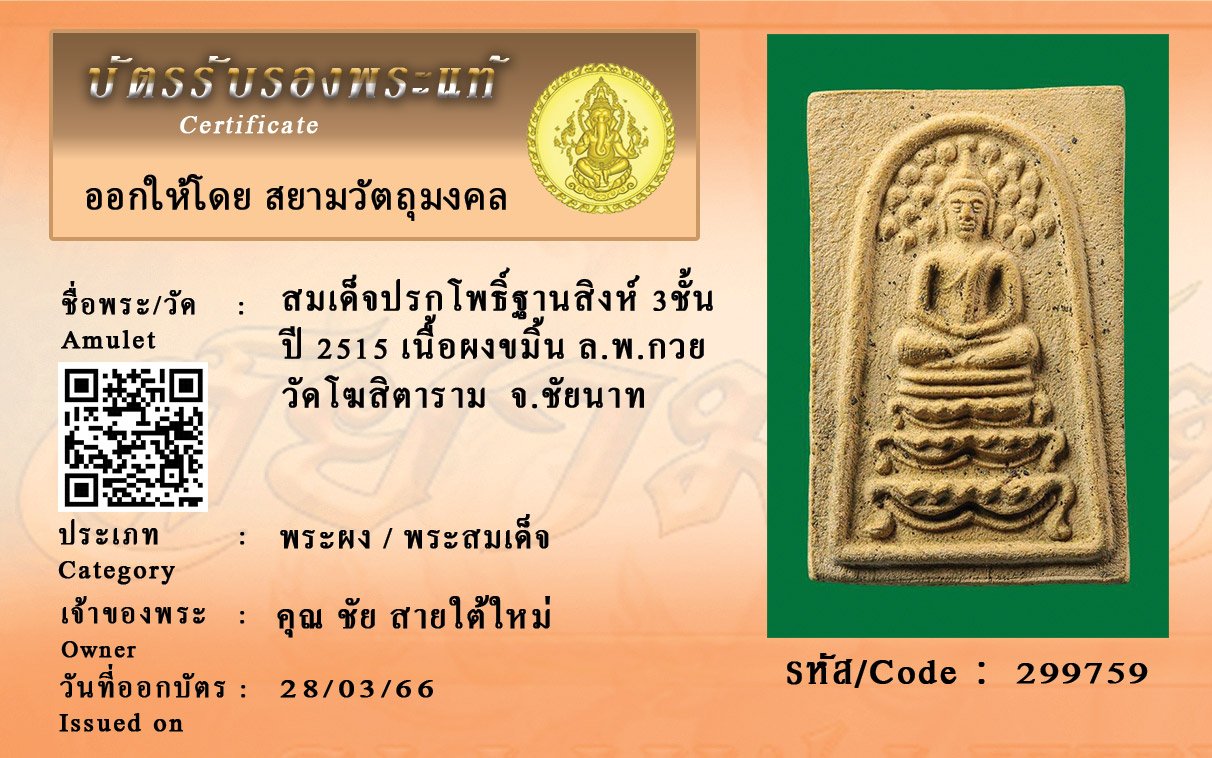 รหัสสินค้า : 299759 สมเด็จปรกโพธิ์ฐานสิงห์ 3ชั้น ปี 2515 เนื้อผงขมิ้น ล.พ.กวย วัดโฆสิตาราม จ.ชัยนาท