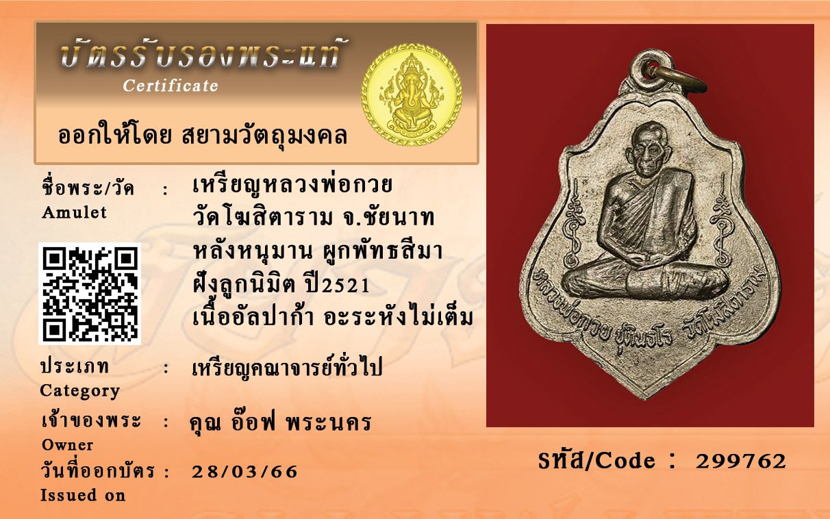 รหัสสินค้า : 299762 เหรียญหลวงพ่อกวย วัดโฆสิตาราม จ.ชัยนาท หลังหนุมาน ผูกพัทธสีมา ฝังลูกนิมิต ปี2521 เนื้ออัลปาก้า อะระหังไม่เต็ม