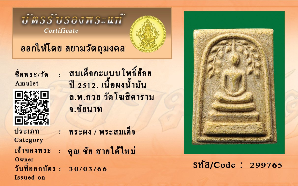 รหัสสินค้า : 299765 สมเด็จคะแนนโพธิ์ย้อย ปี 2512. เนื้อผงน้ำมัน ล.พ.กวย วัดโฆสิตาราม จ.ชัยนาท