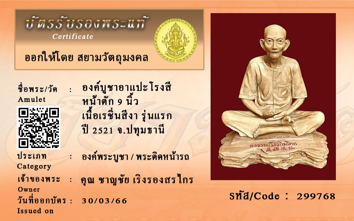 รหัสสินค้า : 299768 องค์บูชาอาแปะโรงสี หน้าตัก 9 นิ้ว เนื้อเรชิ่นสีงา รุ่นแรก ปี 2521 จ.ปทุมธานี