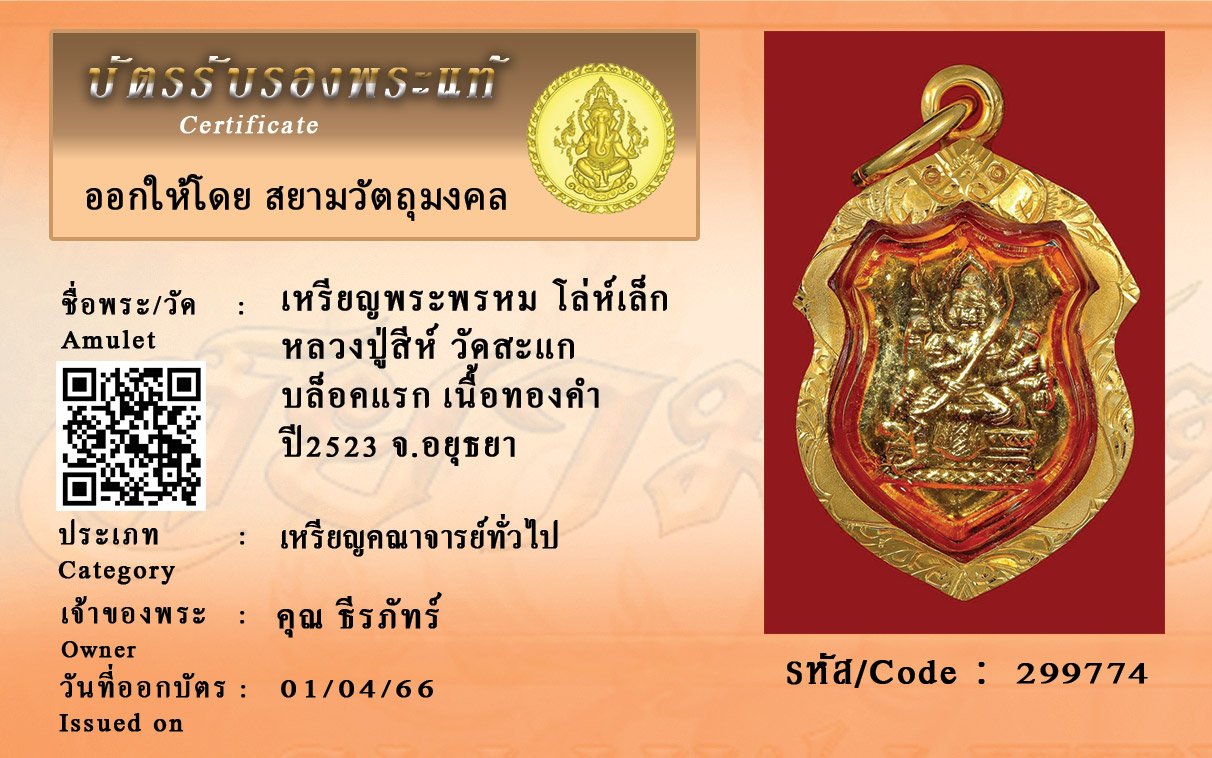 รหัสสินค้า : 299774 เหรียญพระพรหม โล่ห์เล็ก หลวงปู่สีห์ วัดสะแก บล็อคแรก เนื้อทองคำ ปี2523 จ.อยุธยา
