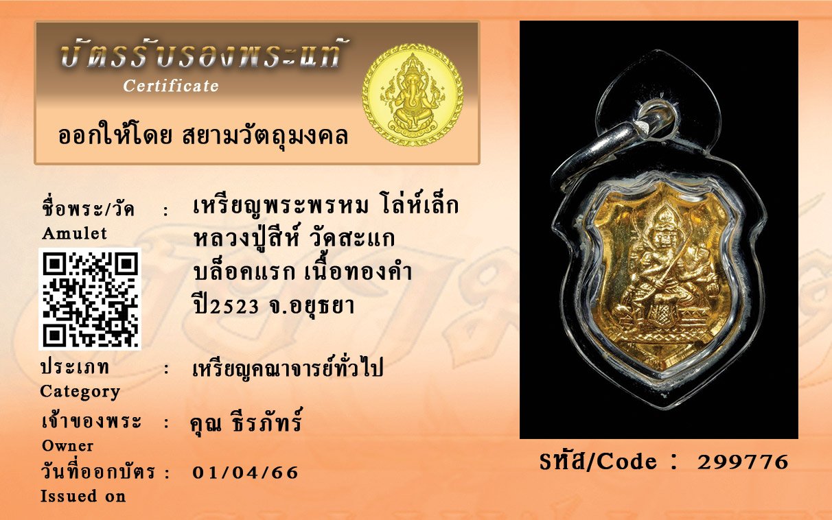 รหัสสินค้า : 299776 เหรียญพระพรหม โล่ห์เล็ก หลวงปู่สีห์ วัดสะแก บล็อคแรก เนื้อทองคำ ปี2523 จ.อยุธยา