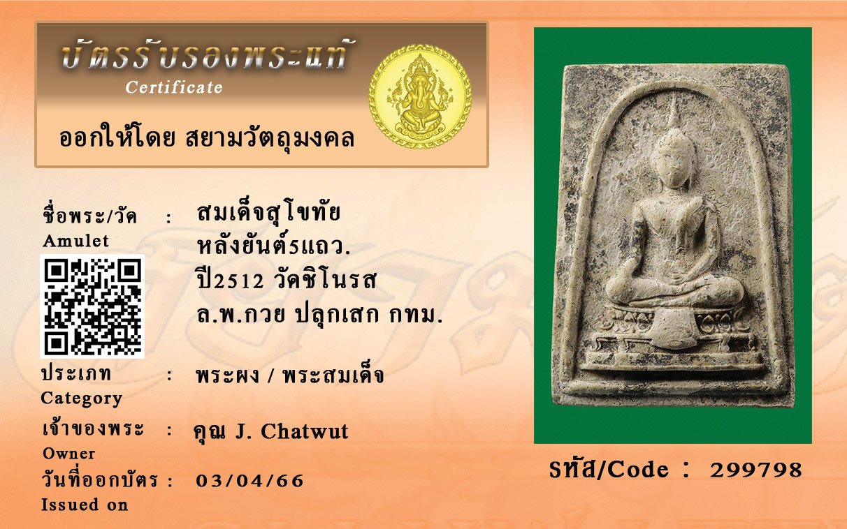 รหัสสินค้า : 299798 สมเด็จสุโขทัย หลังยันต์5แถว. ปี2512 วัดชิโนรส ล.พ.กวย ปลุกเสก กทม.
