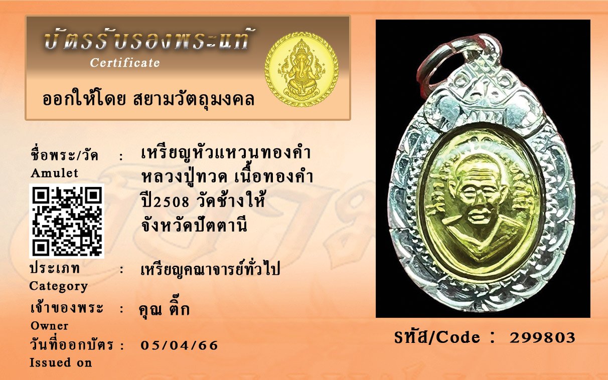 รหัสสินค้า : 299803 เหรียญหัวแหวนทองคำ หลวงปู่ทวด เนื้อทองคำ ปี2508 วัดช้างให้ จังหวัดปัตตานี