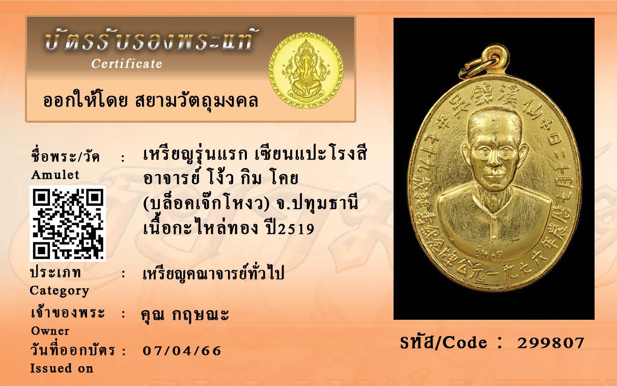 รหัสสินค้า : 299807 เหรียญรุ่นแรก เซียนแปะโรงสี อาจารย์ โง้ว กิม โคย (บล็อคเจ๊กโหงว) จ.ปทุมธานี เนื้อกะไหล่ทอง ปี2519