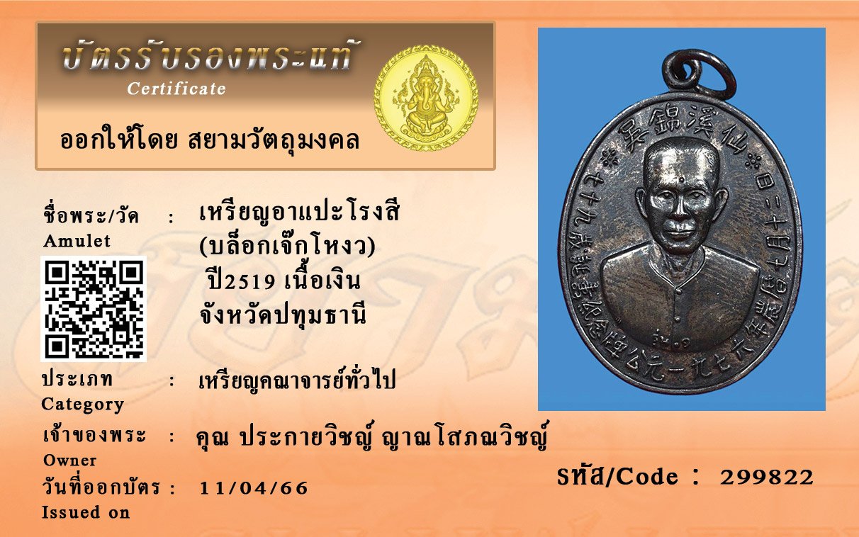 รหัสสินค้า : 299822 เหรียญอาแปะโรงสี (บล็อกเจ๊กโหงว) ปี2519 เนื้อเงิน จังหวัดปทุมธานี