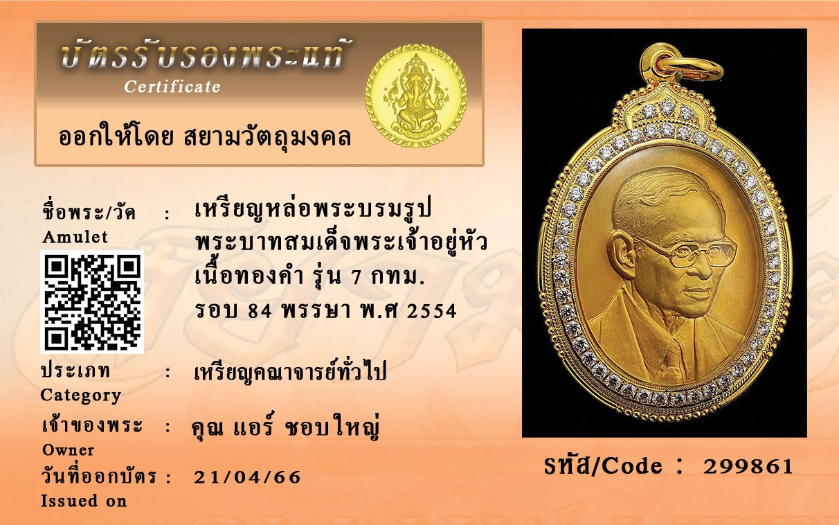 รหัสสินค้า : 299861 เหรียญหล่อพระบรมรูป พระบาทสมเด็จพระเจ้าอยู่หัว เนื้อทองคำ รุ่น 7 กทม. รอบ 84 พรรษา พ.ศ 2554