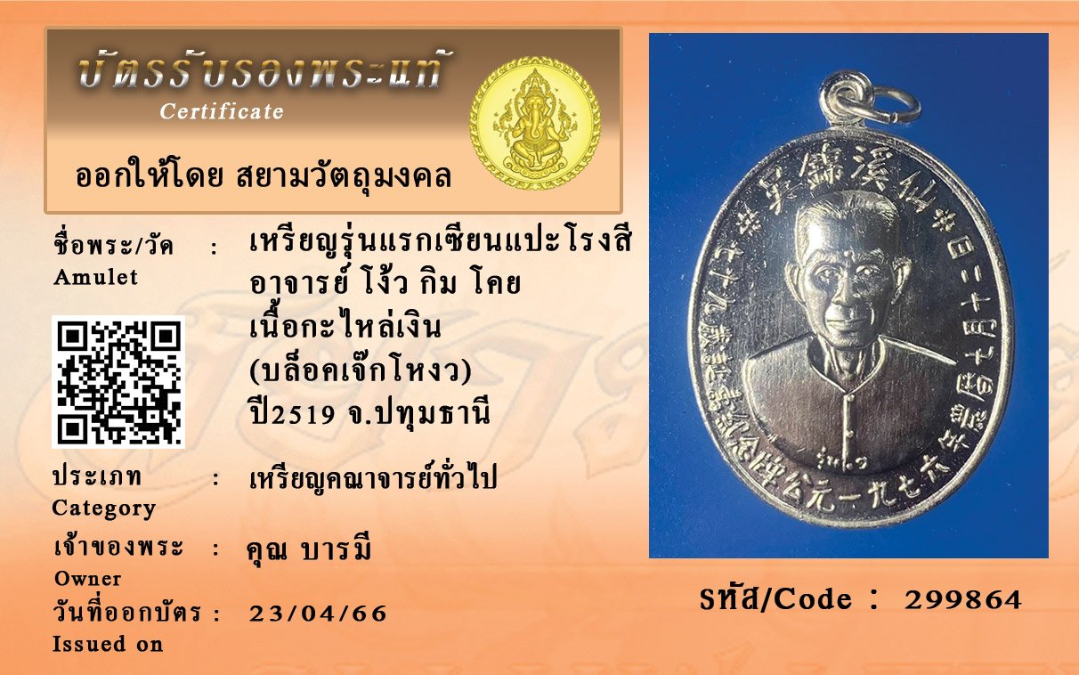รหัสสินค้า : 299864 เหรียญรุ่นแรกเซียนแปะโรงสี อาจารย์ โง้ว กิม โคย เนื้อกะไหล่เงิน (บล็อคเจ๊กโหงว) ปี2519 จ.ปทุมธานี